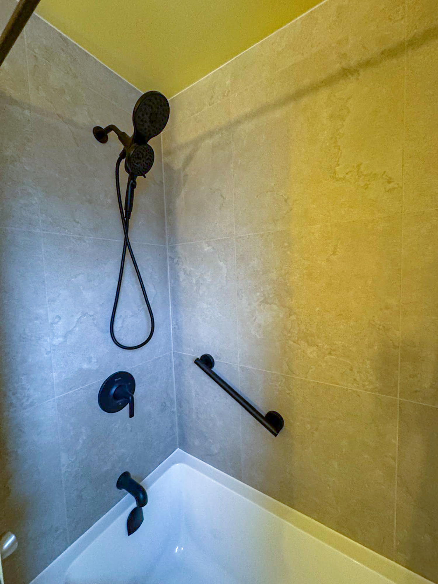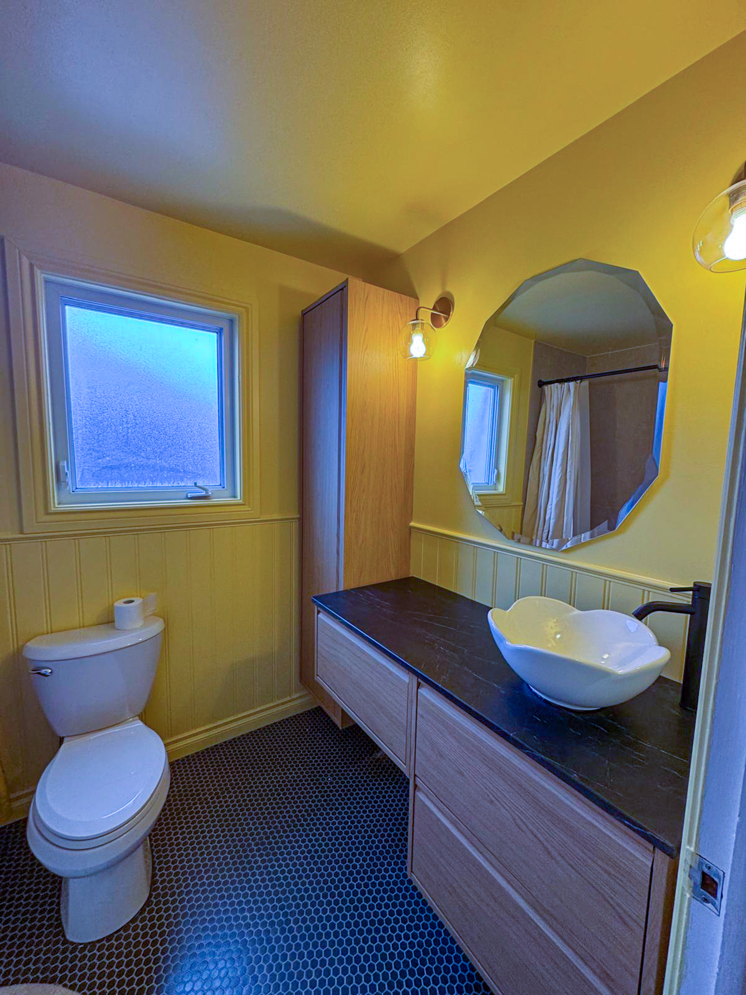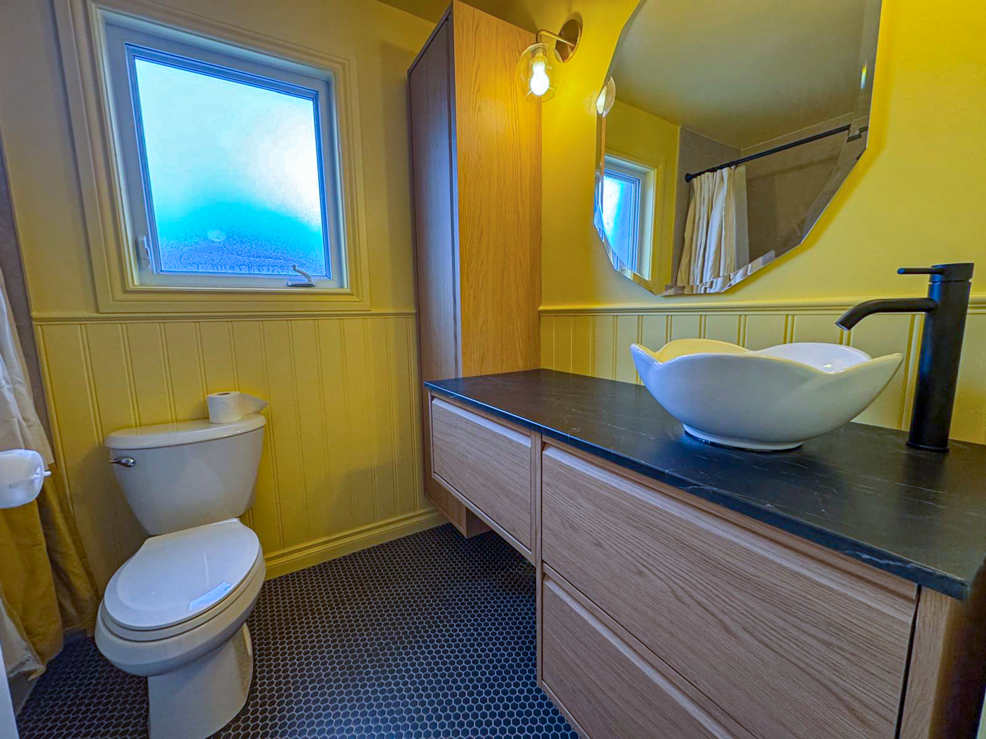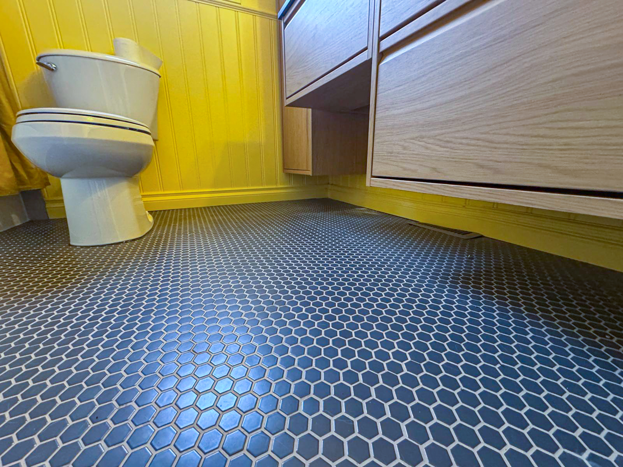 When it comes to bathroom remodeling, many homeowners stick to neutrals, but this client wanted something different. We installed bright yellow beadboard wainscoting that instantly energizes the room. To balance this warmth, we chose a striking dark charcoal penny tile for the flooring, providing a sophisticated, tactile foundation that grounds the entire design.