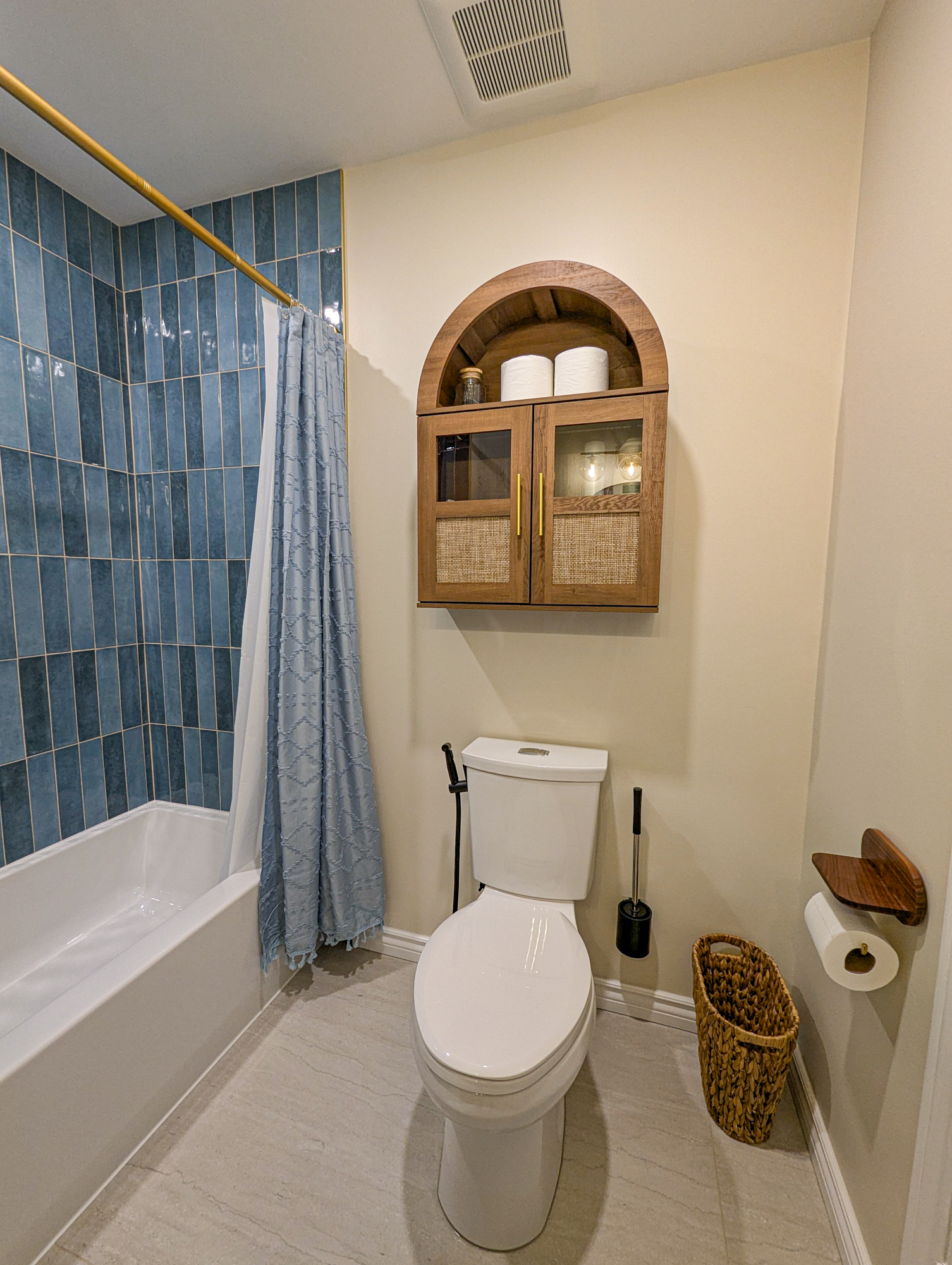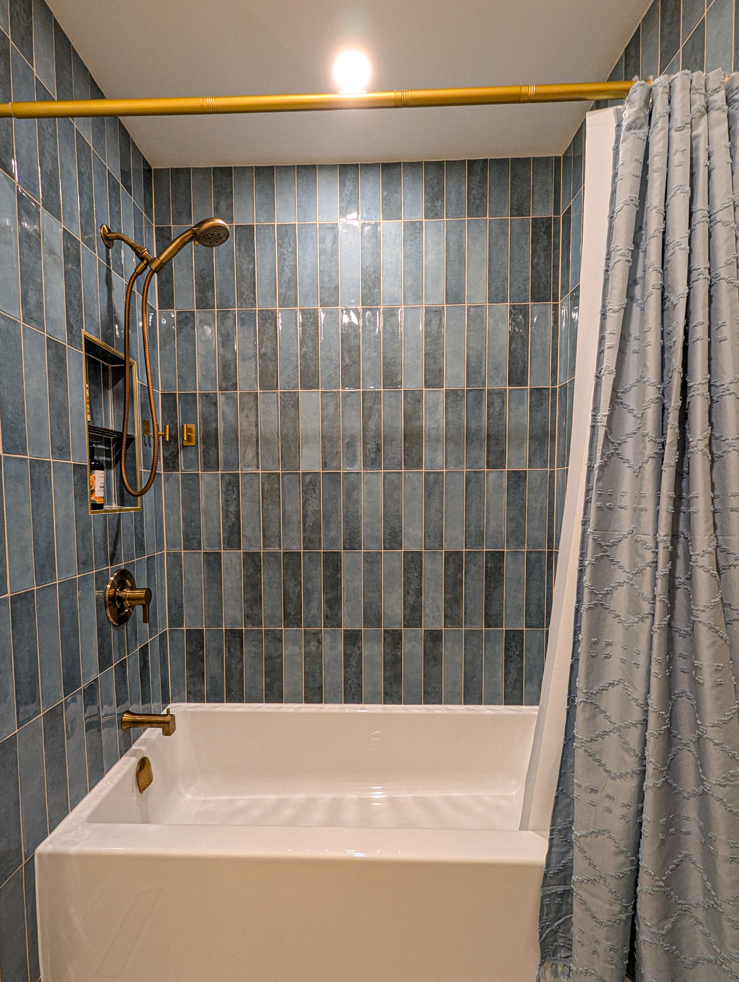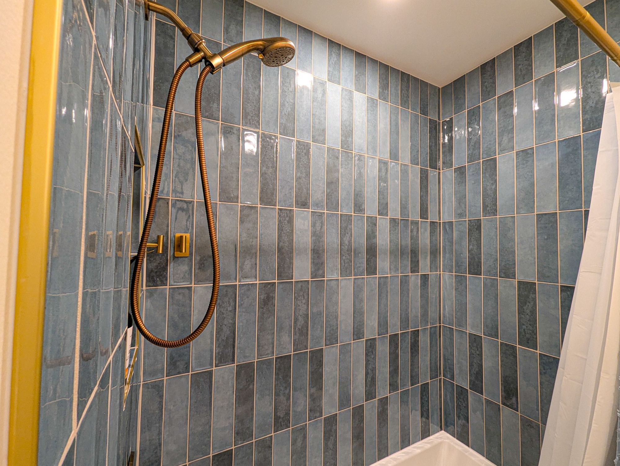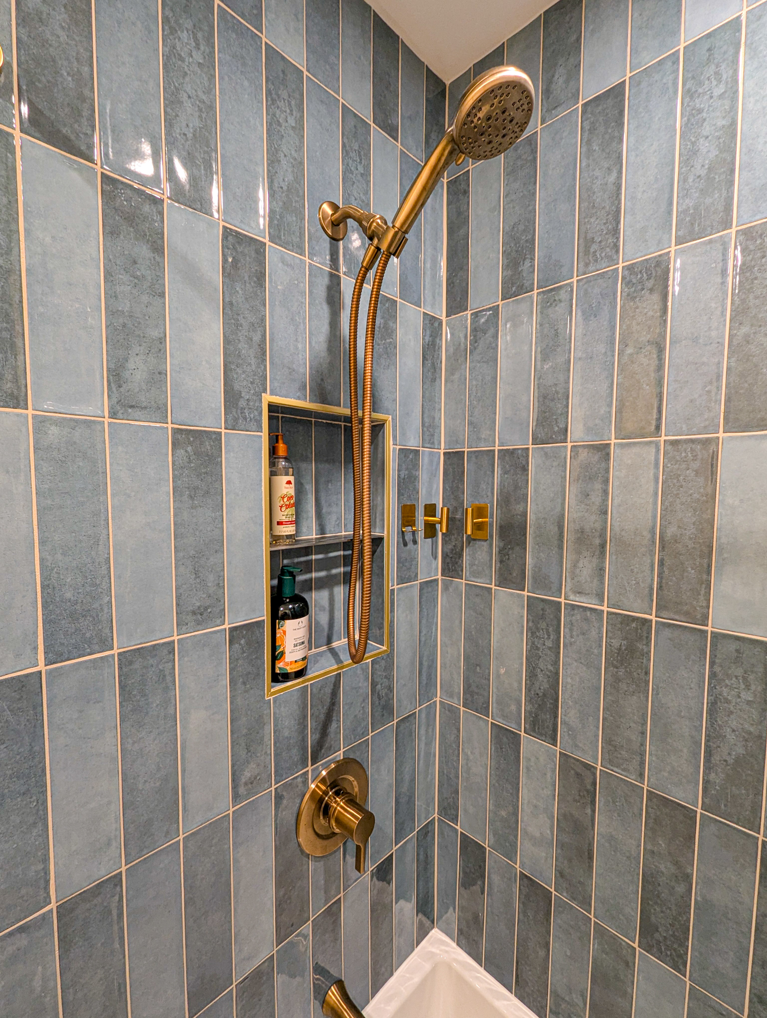 Blue tile reads cool. Gold reads warm. The combination adds contrast and keeps the space feeling inviting while staying modern.