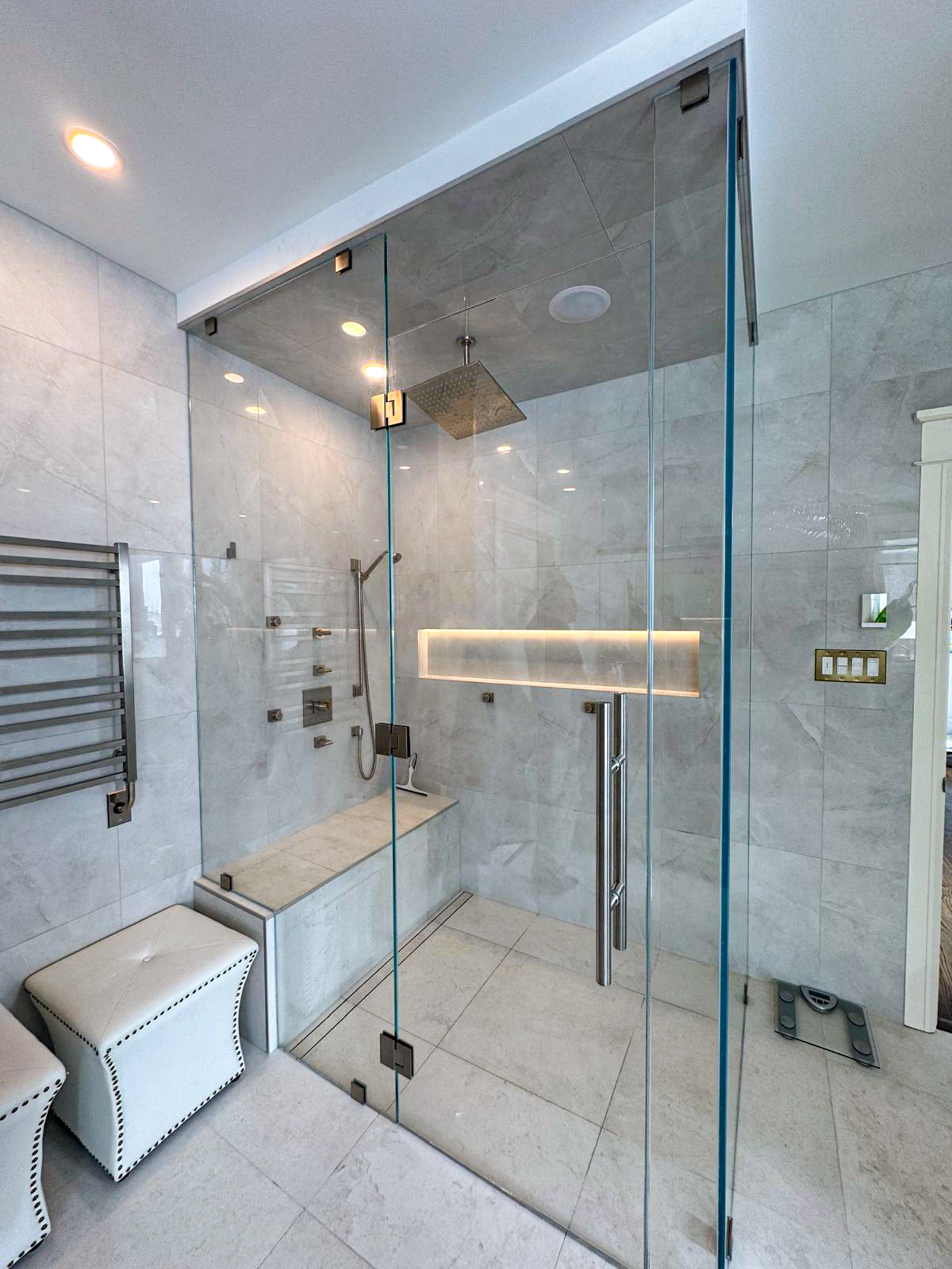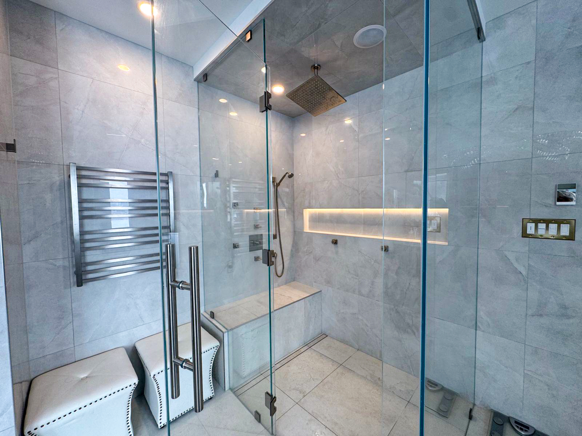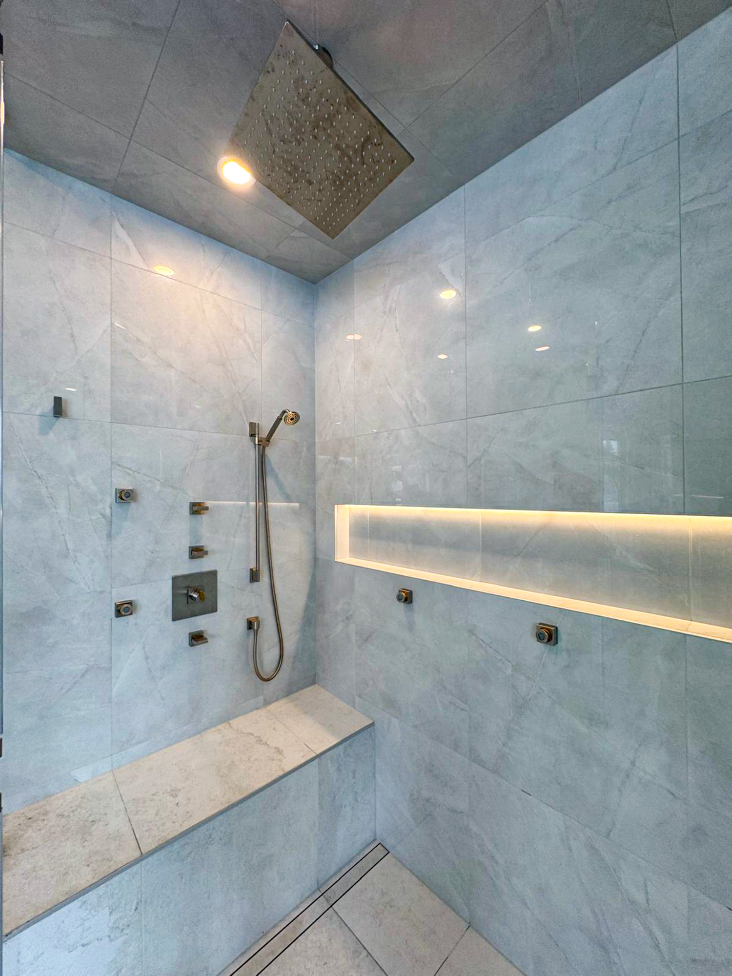 The new shower was designed for comfort and impact. It features a seamless glass enclosure, a built-in bench, premium tile, and a recessed niche. The shower also includes spa-style features such as lighting, jets, speakers, and a rain showerhead. For homeowners thinking about replacing an outdated tub, our tub to shower conversion service is another strong option.