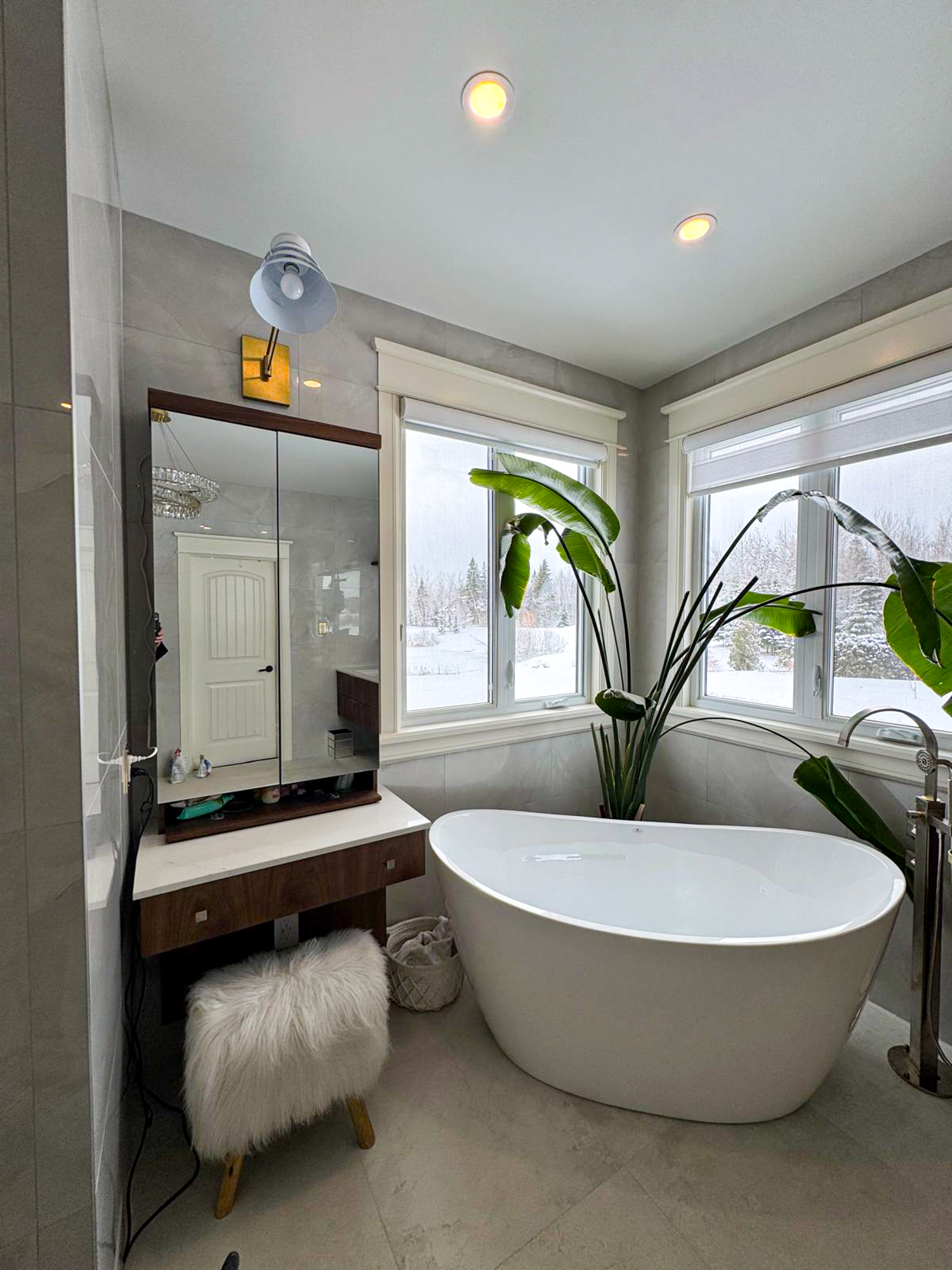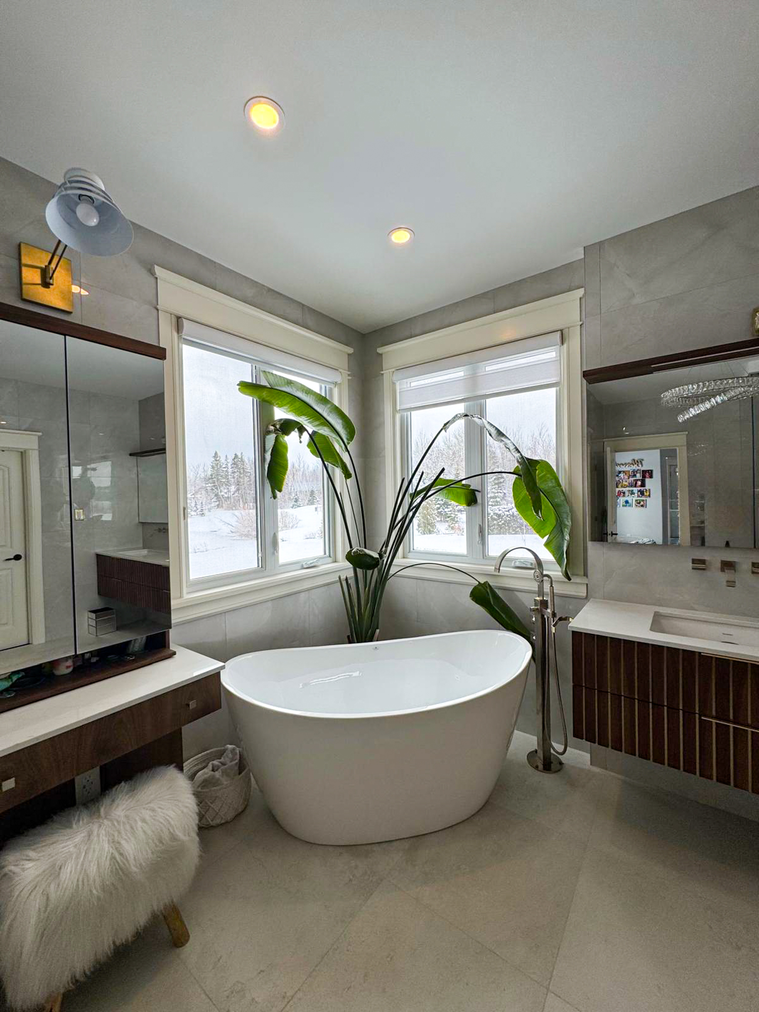 Lighting played a big role in how the room feels. We combined vanity lighting, a chandelier, and dimmable pot lights so the homeowners could shift the mood from bright and functional in the morning to soft and quiet in the evening.