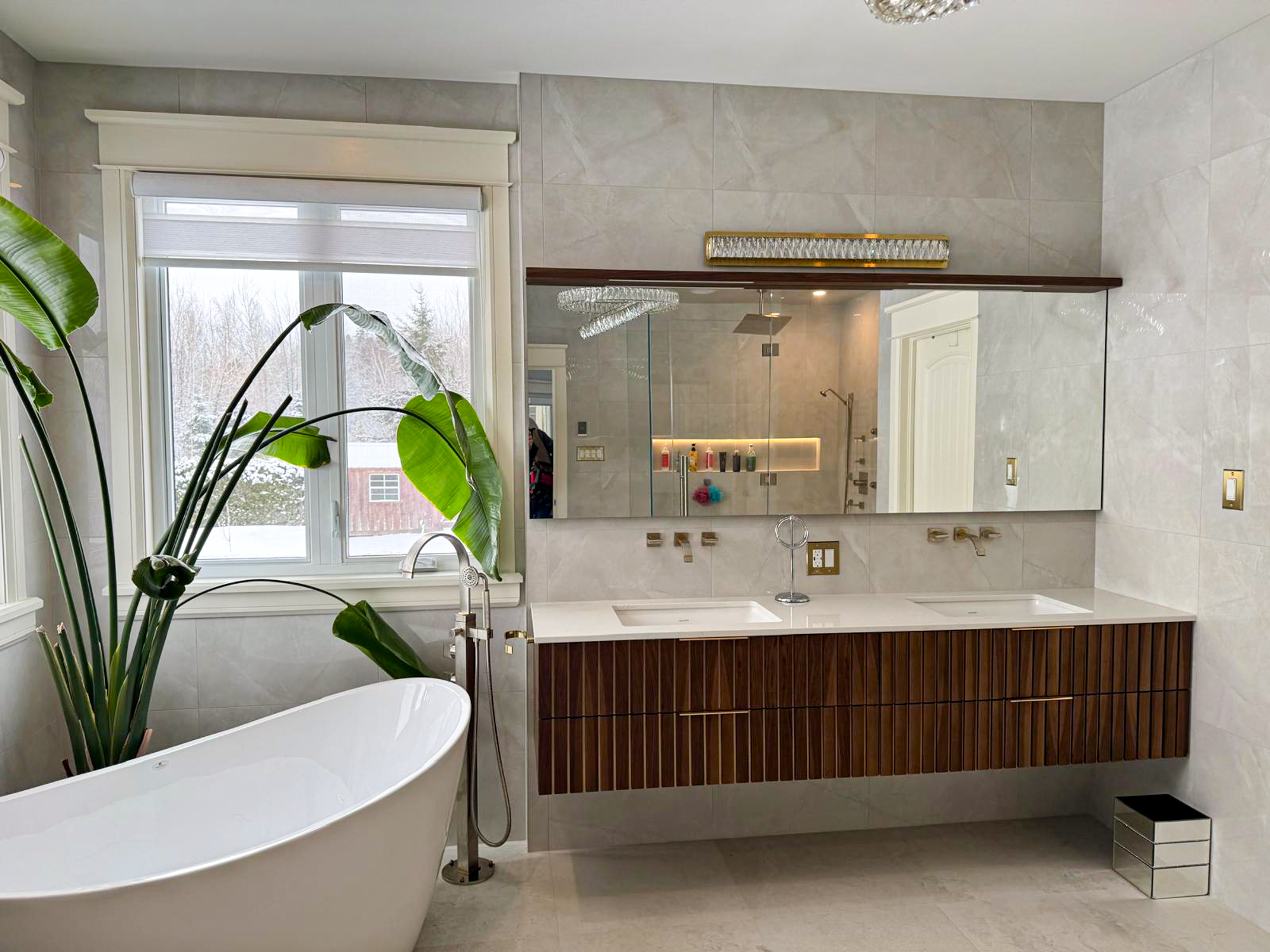 We installed a custom double vanity with a rich wood-grain finish and a crisp white countertop. Brushed gold faucets and matching hardware helped tie the room together and added warmth against the softer wall and tile tones.